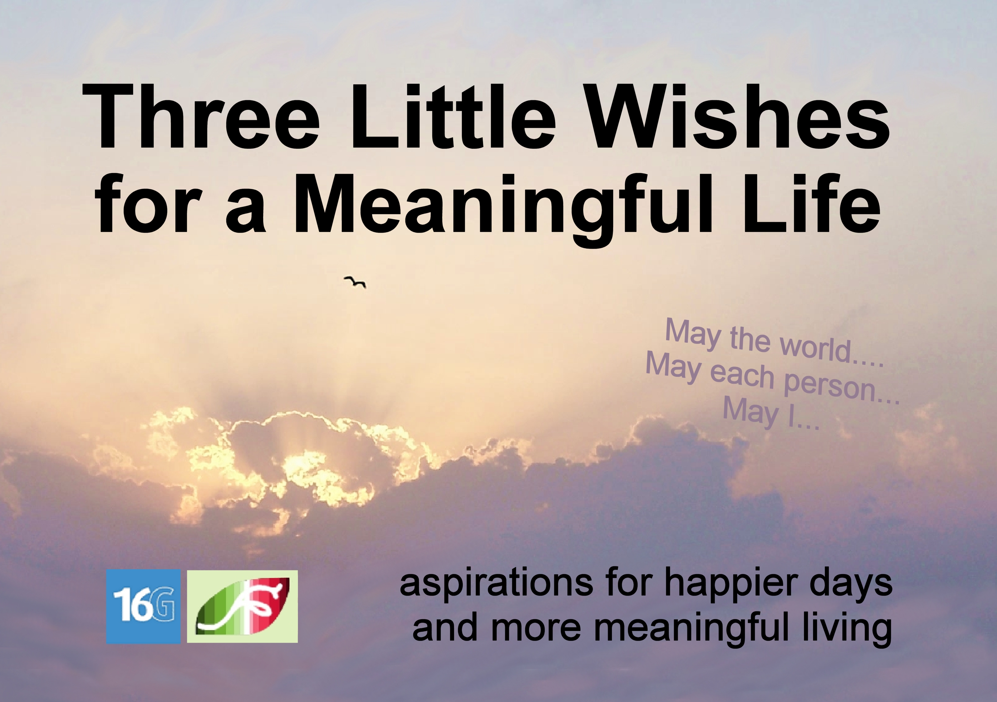 Use the Three Little Wishes for a Meaningful Life photo booklet to visualize then help create a more positive world. Spend one minute to wish, "May the world..." "May each person..." or "May I ....", one week at a time for a year, working through 16 virtues. Originally this was a 2012 calendar inspired by 16 Guidelines for Life, then an app that was downloaded into 70 countries before it was retired in 2018. The Three Wishes for a Meaningful Life app content is archived and still viewable and accessible at this 3W Calendar app photo album.
